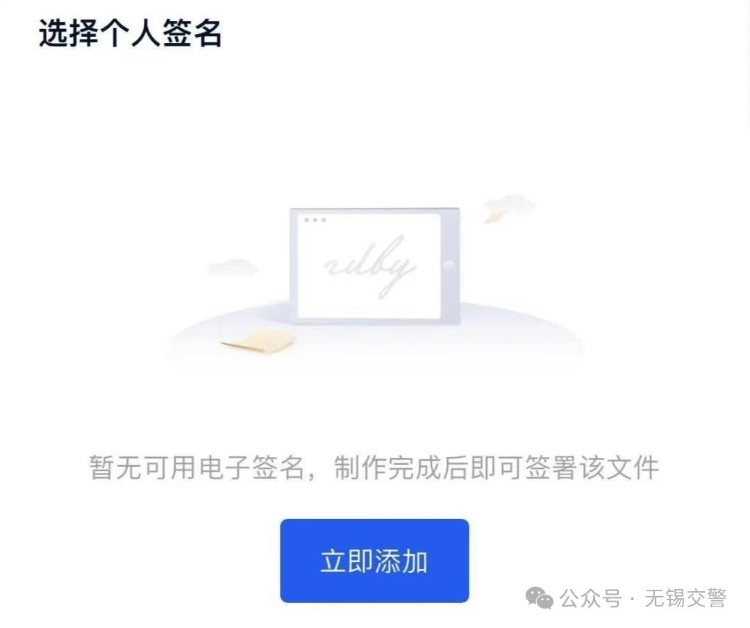 ?。?)實名認證通過后,可以簽署文件,如果沒有個人簽名,需要先點擊添加個人簽名,如下圖: