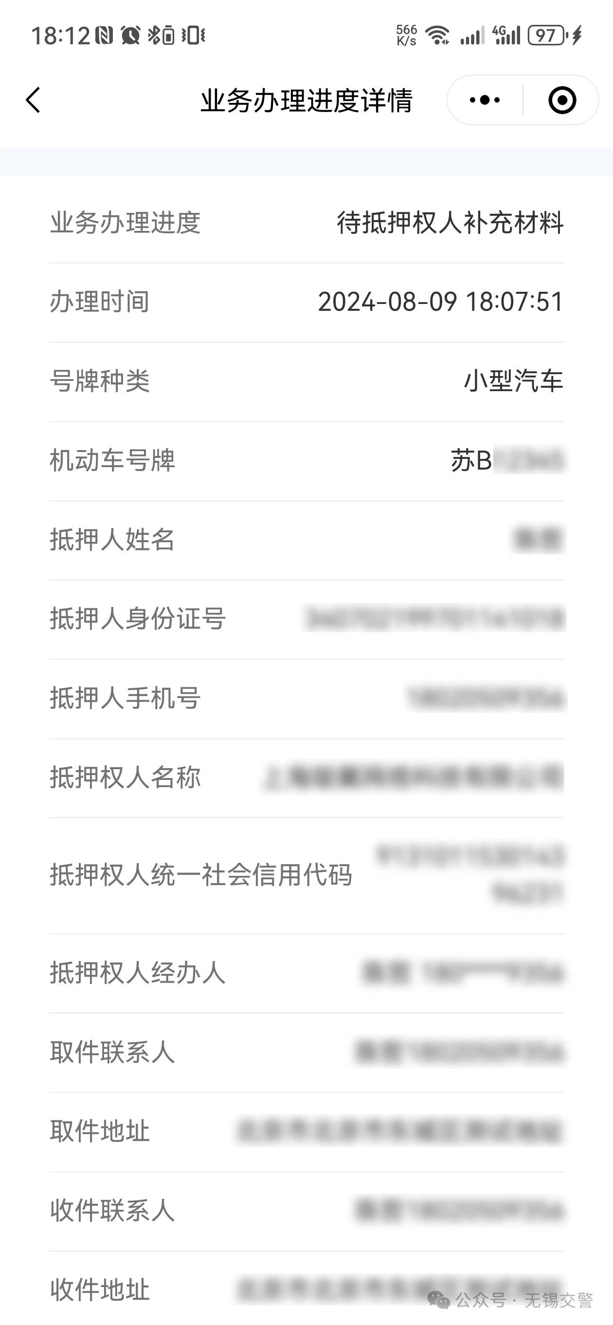 (1)在抵押權人對車主提交的資料進行審核和補充后,系統(tǒng)將給車主發(fā)送一條短信,請注意及時查收,如下圖: