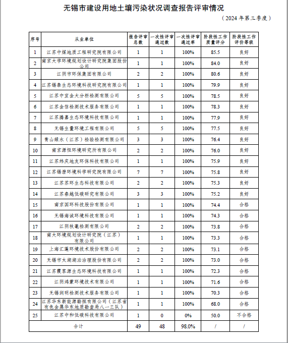根據(jù)《無錫市建設(shè)用地土壤污染狀況調(diào)查從業(yè)單位工作質(zhì)量評價辦法(試行)》,我局對全市2024年第三季度建設(shè)用地土壤污染狀況調(diào)查報告評審情況進行了匯總,相關(guān)情況公示如下: