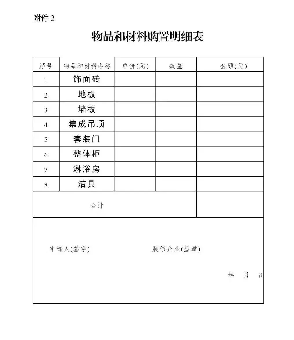 2024年7月25日(含)至2024年12月31日(含)期間簽訂住宅裝修協(xié)議,由裝修公司代為購(gòu)置用于舊房(包括城鎮(zhèn)住宅和農(nóng)村住宅)裝修、廚衛(wèi)等局部改造所需的物品和材料,包括飾面磚、地板、墻板、集成吊頂、套裝門(mén)、整體柜、淋浴房、潔具。