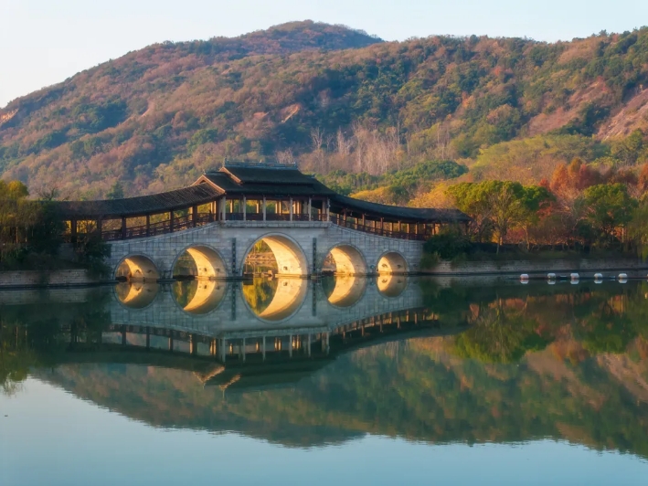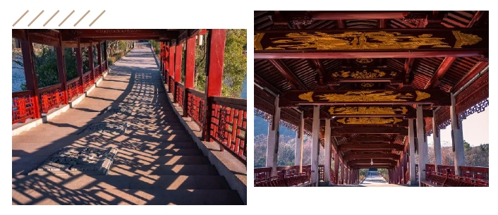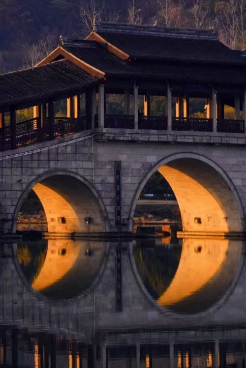 早上7、8點左右,橙黃色的陽光順次穿過石塘廊橋,看著5個橋洞依次被太陽染上一抹金光,遠遠望去光影璀璨好看極了。“金光穿洞”的奇妙景觀源于古人在橋的設(shè)計中運用了光的折射原理,當(dāng)太陽高度角到達最小值時,光線呈現(xiàn)出一種斜長的光影,能夠照射到平時不易觸及的橋洞區(qū)域。