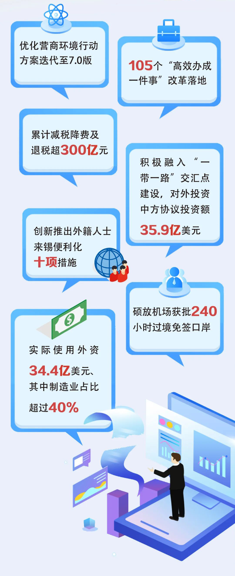 2024年,無錫,“優(yōu)”潮涌動!營商環(huán)境優(yōu)化助力企業(yè)騰飛,優(yōu)化營商環(huán)境行動方案7.0版、“高效辦成一件事”、減稅降費、外籍人士來錫便利化十項措施……無錫通過簡化審批流程、優(yōu)化政務(wù)服務(wù),切實為企業(yè)減負(fù)增效,真正做到企有所呼、政必有應(yīng),營造政策透明、服務(wù)高效、市場開放的環(huán)境,使企業(yè)家們“游刃有余”,充分激發(fā)創(chuàng)新活力與商業(yè)潛能。