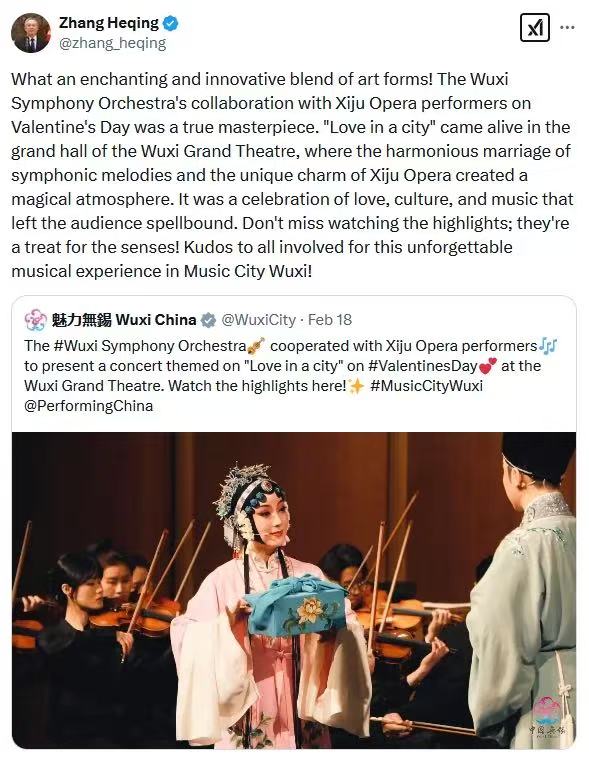 無錫海外社交媒體賬號(hào)跟進(jìn)發(fā)布了演出內(nèi)容,中國駐巴基斯坦大使館原文化參贊張和清也在海外社交平臺(tái)上轉(zhuǎn)發(fā)了相關(guān)內(nèi)容并給予高度評(píng)價(jià)!