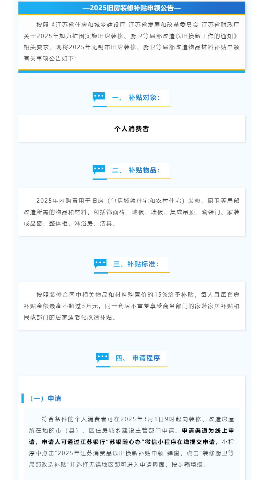 2025年舊房裝修廚衛(wèi)等局部改造物品材料補貼申領公告