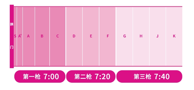 號(hào)碼布左上角的字母代表著你的出發(fā)分區(qū)。12個(gè)出發(fā)分區(qū)中,S、A+、A、B、C區(qū)為馬拉松項(xiàng)目,D、E、F、G、H、J區(qū)為全半程混編,K區(qū)為歡樂跑項(xiàng)目,且集結(jié)區(qū)最后為非競(jìng)速輪椅選手和推嬰兒車選手。