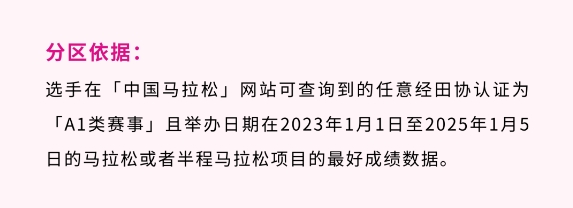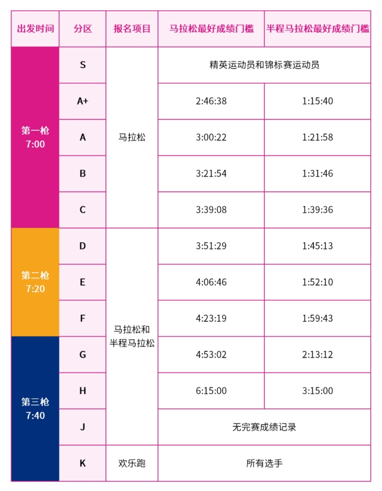 如果你符合該分區(qū)對(duì)應(yīng)的報(bào)名項(xiàng)目且最好成績(jī)達(dá)到該分區(qū)對(duì)應(yīng)的成績(jī)門檻(馬拉松或半程馬拉松中的任意一個(gè))就會(huì)被編入相應(yīng)分區(qū)與旗鼓相當(dāng)?shù)倪x手一同起跑!