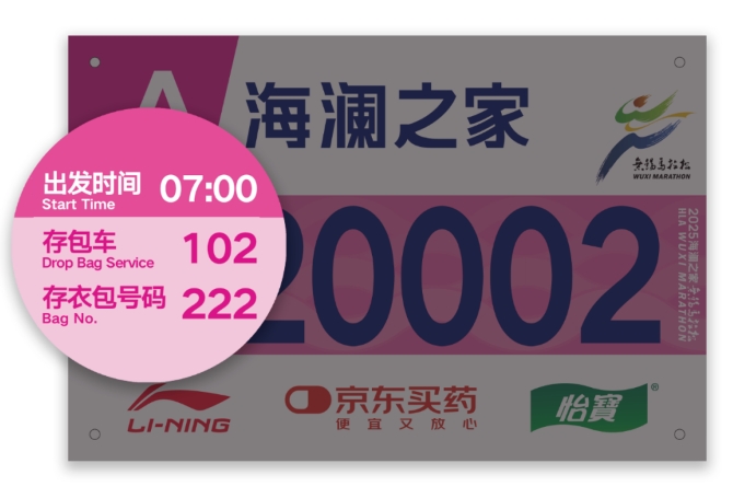 在分區(qū)字母和參賽號(hào)數(shù)字之外,號(hào)碼布中還將包含你的出發(fā)時(shí)間、存包車與存衣包號(hào)碼等更多的信息。錫馬的存包服務(wù)將面向馬拉松和半程馬拉松選手,比賽日,請(qǐng)按存包車編號(hào)前往對(duì)應(yīng)區(qū)域進(jìn)行存取包。別忘了,報(bào)到時(shí)領(lǐng)取的小號(hào)碼布,需要提前粘貼在你的存衣包上(劇透:今年的小號(hào)碼布是進(jìn)化版哦~)