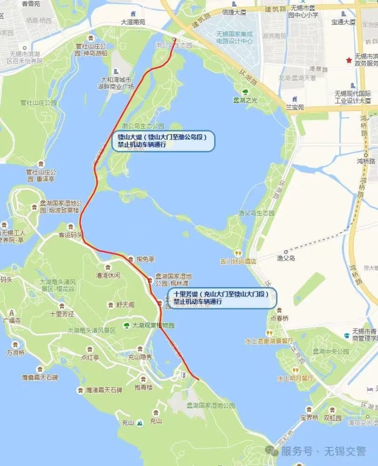 二、2025 年 4 月 12 日 7 時起至 4 月 13 日 20 時止,4 月 19 日 7 時起至 4 月 20 日 20 時止,黿頭渚景區(qū)十里芳堤(充山大門至犢山大門段)、犢山大堤(犢山大門至渤公島段)實(shí)行臨時封閉,禁止機(jī)動車輛通行(公交車、接駁車和特種車輛除外)。