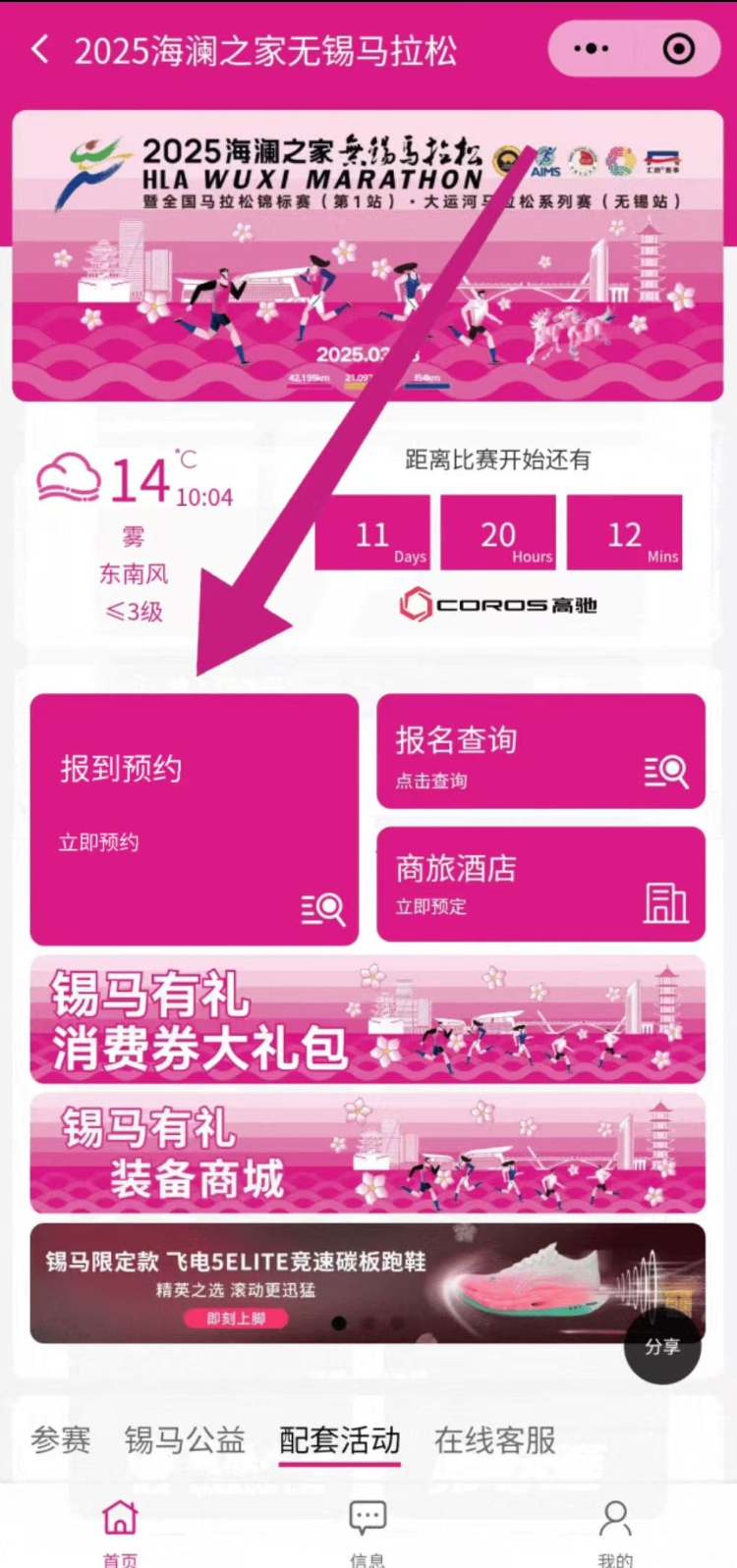 1. 先預(yù)約,后報(bào)到。未預(yù)約到場(chǎng)將無(wú)法領(lǐng)取參賽物品;2. 參賽選手須在錫馬「參賽助手」小程序預(yù)約報(bào)到時(shí)段。