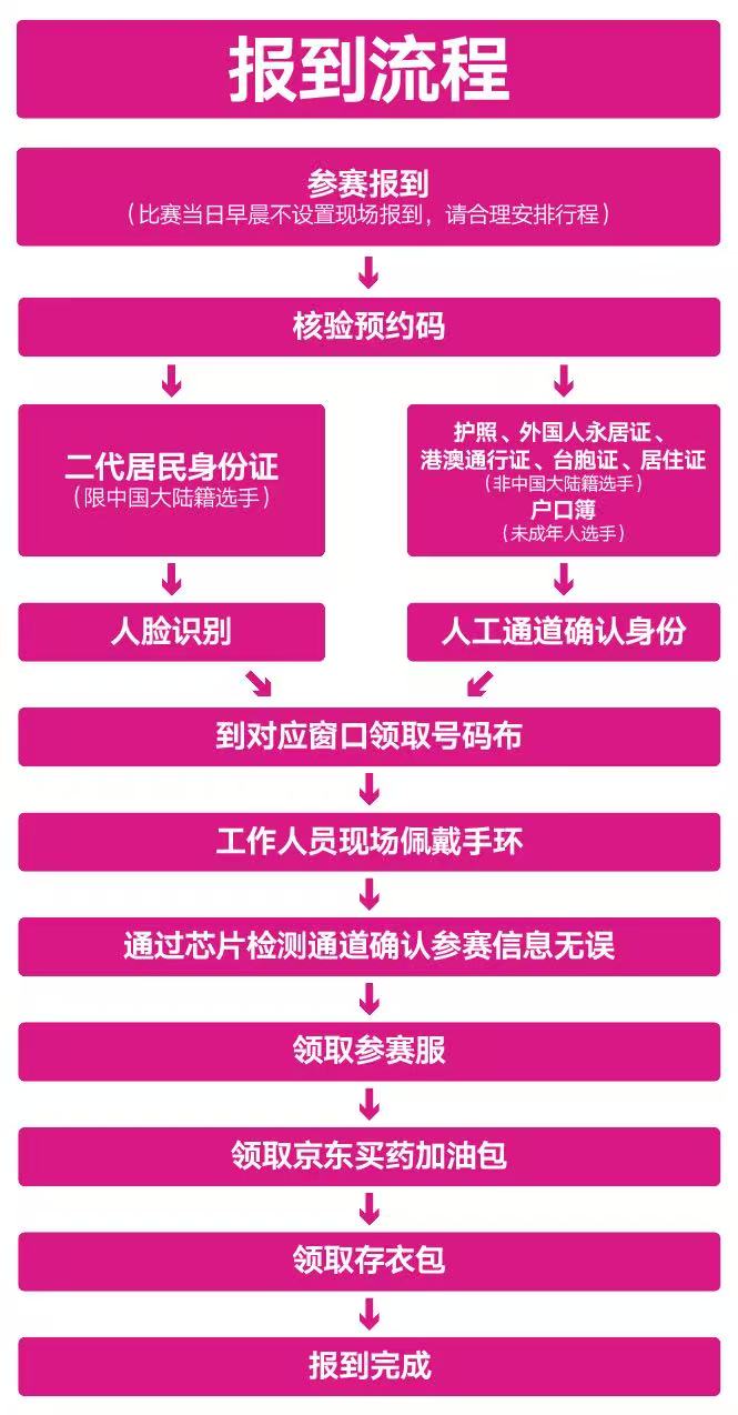1. 中國(guó)大陸籍選手須持二代居民身份證原件;2. 中國(guó)香港、中國(guó)澳門籍選手須持港澳居民來(lái)往內(nèi)地通行證或港澳居民居住證原件;3. 中國(guó)臺(tái)灣籍選手須持臺(tái)灣居民來(lái)往大陸通行證或臺(tái)灣居民居住證原件;4. 外籍選手須持護(hù)照或外國(guó)人永久居留身份證原件;5. 18周歲以下未成年選手,須由其監(jiān)護(hù)人或者法定代理人持監(jiān)護(hù)人證件原件、身份證或戶口簿原件,攜選手本人辦理報(bào)到手續(xù)。*請(qǐng)確保所持證件在有效期內(nèi),并與報(bào)名填報(bào)信息一致。無(wú)上述證件原件者,將拒絕為其發(fā)放參賽物品。