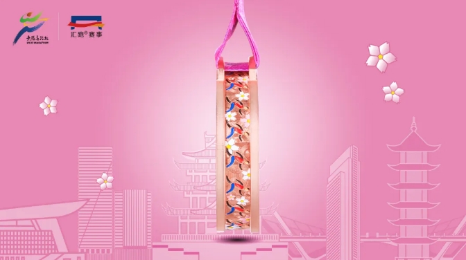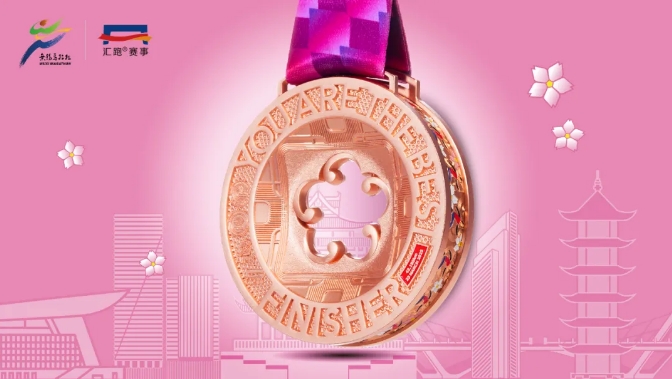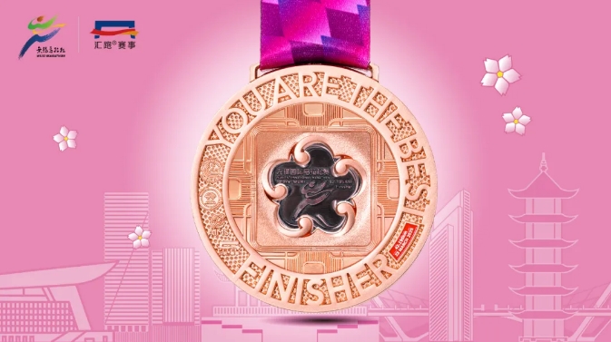 旋轉至獎牌側面,在精密的蝕刻工藝加持下,呈現近似“琺瑯彩”的溫潤釉面,9對跑者穿梭散落櫻花雨中,象征著馬拉松的九種核心精神:堅持、毅力、勇氣、挑戰(zhàn)、突破、成長、蛻變、榮耀、傳承。