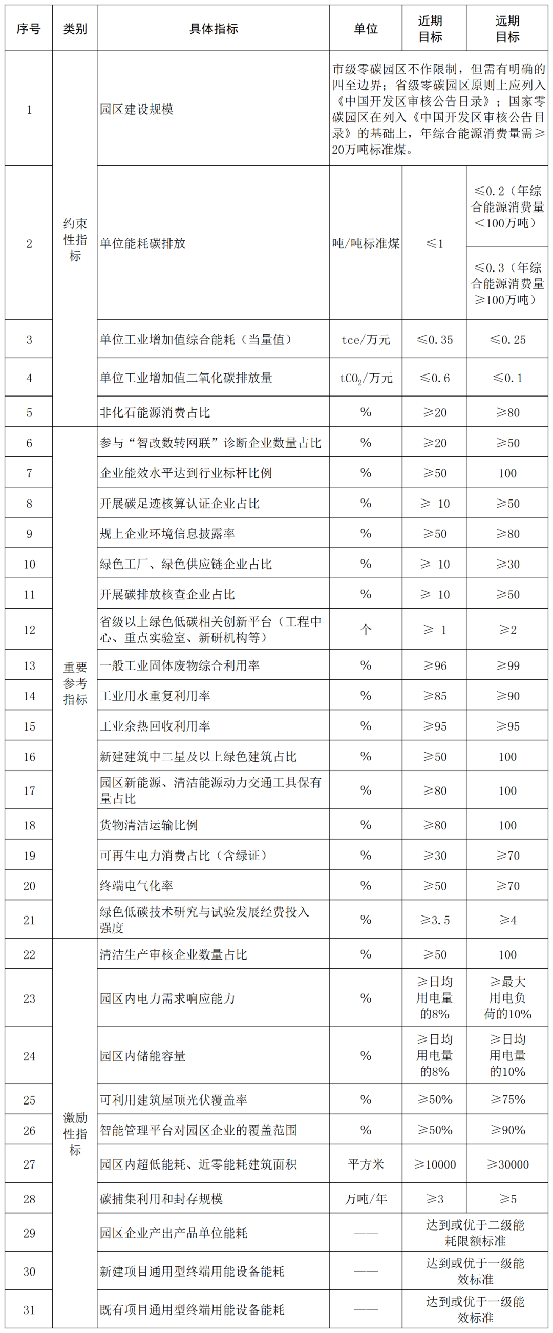 約束性指標:零碳園區(qū)建設必須達到的目標,是遴選確定園區(qū)建設名單和后續(xù)開展驗收評估的首要條件。達不到約束性指標要求的園區(qū),原則上不得申請驗收評估。