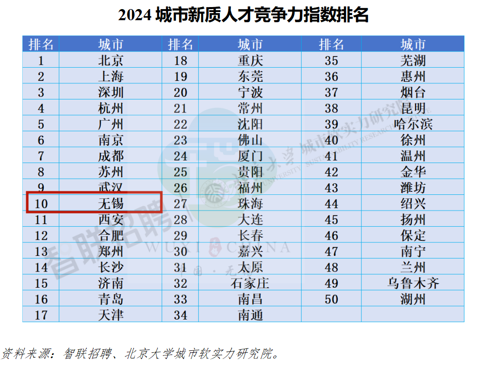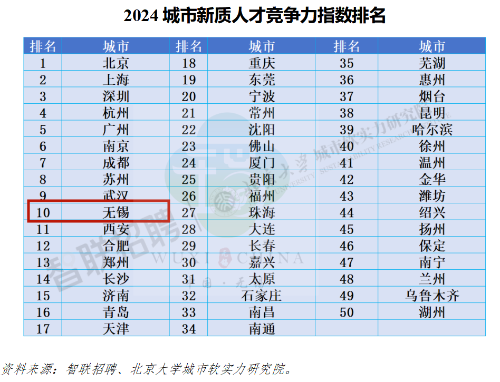 近日,北京大學(xué)城市軟實(shí)力研究院、澤平宏觀團(tuán)隊(duì)分別聯(lián)合智聯(lián)招聘發(fā)布《2024中國(guó)城市新質(zhì)人才競(jìng)爭(zhēng)力指數(shù)報(bào)告》《2024年最具人才吸引力城市100強(qiáng)》。無(wú)錫在這兩項(xiàng)排名中均進(jìn)入全國(guó)十強(qiáng),展現(xiàn)出良好的人才競(jìng)爭(zhēng)力和城市吸引力。