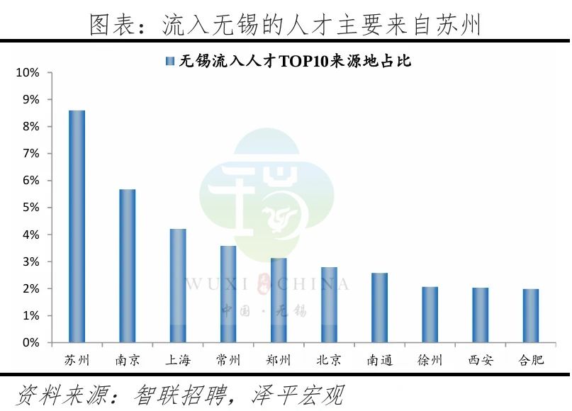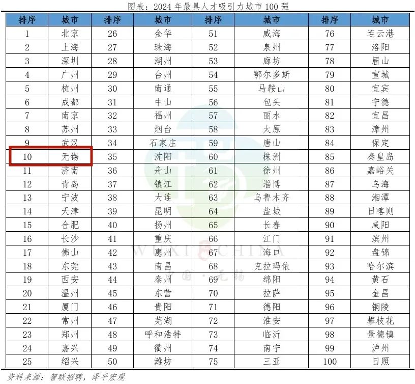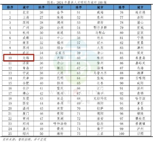 從來(lái)源看,人才流向無(wú)錫的十大城市合計(jì)占比36.6%,低于2023年的37.3%。其中長(zhǎng)三角城市升至5個(gè),合計(jì)占比為26.6%。人才流入無(wú)錫主要因物聯(lián)網(wǎng)、集成電路等產(chǎn)業(yè)發(fā)展迅速,且為與同梯隊(duì)城市相比,無(wú)錫工作機(jī)會(huì)較多,生活成本相對(duì)較小。根據(jù)無(wú)錫市政府?dāng)?shù)據(jù),2024年物聯(lián)網(wǎng)、集成電路等7個(gè)集群規(guī)模超2000億元,入選國(guó)家級(jí)先進(jìn)制造業(yè)集群2個(gè)、累計(jì)5個(gè);入圍中國(guó)“企業(yè)、制造業(yè)、服務(wù)業(yè)、民營(yíng)企業(yè)”500強(qiáng)榜單企業(yè)12家、23家、19家、25家,均列江蘇省第一。同時(shí),無(wú)錫引才舉措較多,2016年無(wú)錫出臺(tái)“太湖人才計(jì)劃”,重點(diǎn)支持引進(jìn)、培育六類產(chǎn)業(yè)發(fā)展重點(diǎn)人才,制定工作補(bǔ)貼、薪酬補(bǔ)貼、安家補(bǔ)貼等各項(xiàng)福利政策,并不斷更新迭代。還采用“以賽引才”模式,針對(duì)重點(diǎn)產(chǎn)業(yè)發(fā)展方向,開(kāi)辦創(chuàng)新創(chuàng)業(yè)大賽,吸引海內(nèi)外人才等。2024年在“中國(guó)年度最佳雇主”評(píng)選中,無(wú)錫連續(xù)第6年榮獲“中國(guó)年度最佳引才城市”。2024年,無(wú)錫引進(jìn)大學(xué)生10.2萬(wàn)人、高層次人才1.1萬(wàn)人。并出臺(tái)《關(guān)于更大力度支持優(yōu)秀青年人才來(lái)錫發(fā)展的十項(xiàng)措施》,發(fā)布年度重點(diǎn)產(chǎn)業(yè)緊缺人才需求目錄,為人才引進(jìn)提供精準(zhǔn)指引。