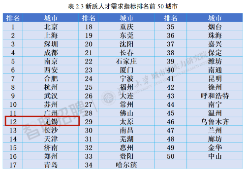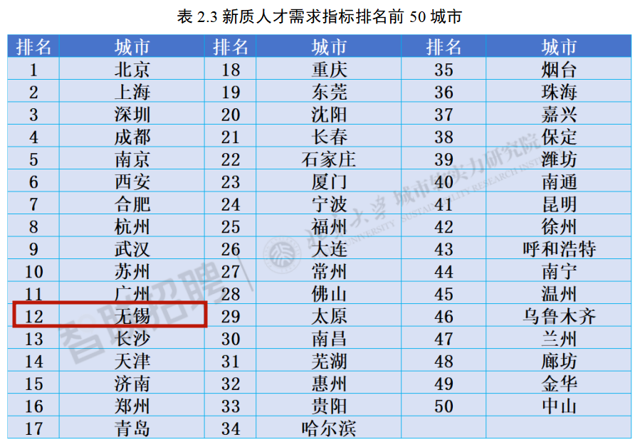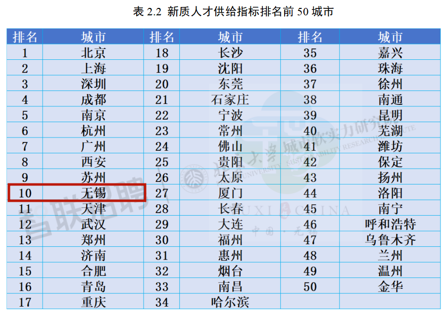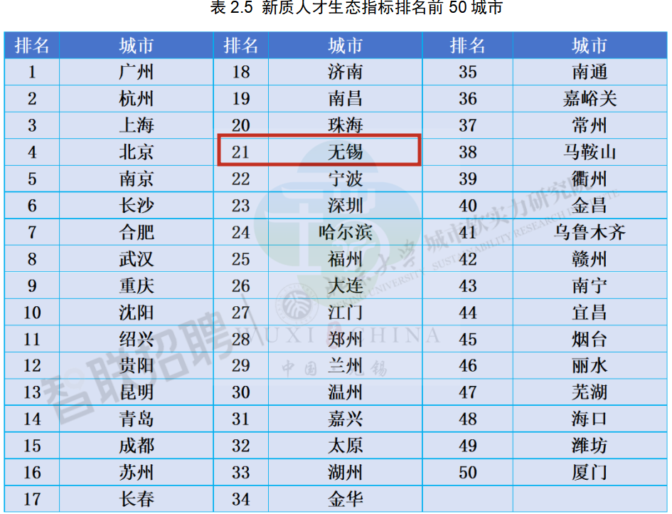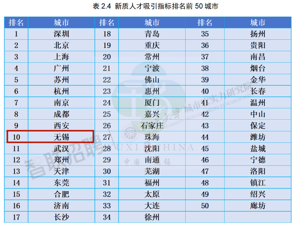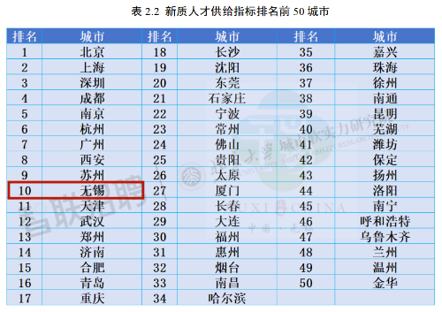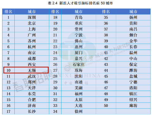 從《2024中國(guó)城市新質(zhì)人才競(jìng)爭(zhēng)力指數(shù)報(bào)告》細(xì)分領(lǐng)域看:在新質(zhì)人才供給指標(biāo)排名前50的城市中,無(wú)錫位居第10;在新質(zhì)人才需求指標(biāo)排名前50的城市中,無(wú)錫位居第12;在新質(zhì)人才吸引指標(biāo)排名前50的城市中,無(wú)錫位居第10;在新質(zhì)人才生態(tài)指標(biāo)排名前50的城市中,無(wú)錫位居第21。