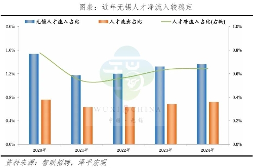 《2024年最具人才吸引力城市100強(qiáng)》的無(wú)錫總況:無(wú)錫近年人才凈流入較穩(wěn)定,2020-2024年人才凈流入占比分別為0.6%-0.8%之間,占比較穩(wěn)定,人才持續(xù)凈流入,主因物聯(lián)網(wǎng)、集成電路等產(chǎn)業(yè)發(fā)展迅速,且與同梯隊(duì)城市相比,工作機(jī)會(huì)多,生活成本相對(duì)較小等。
