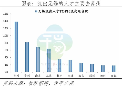 從去向看,無(wú)錫人才流向的前十大城市合計(jì)占比為50.4%,最多的是蘇州,占比13.8%,流出至長(zhǎng)三角城市有8個(gè),合計(jì)占比45.7%,長(zhǎng)三角區(qū)域內(nèi)人才交流密切。