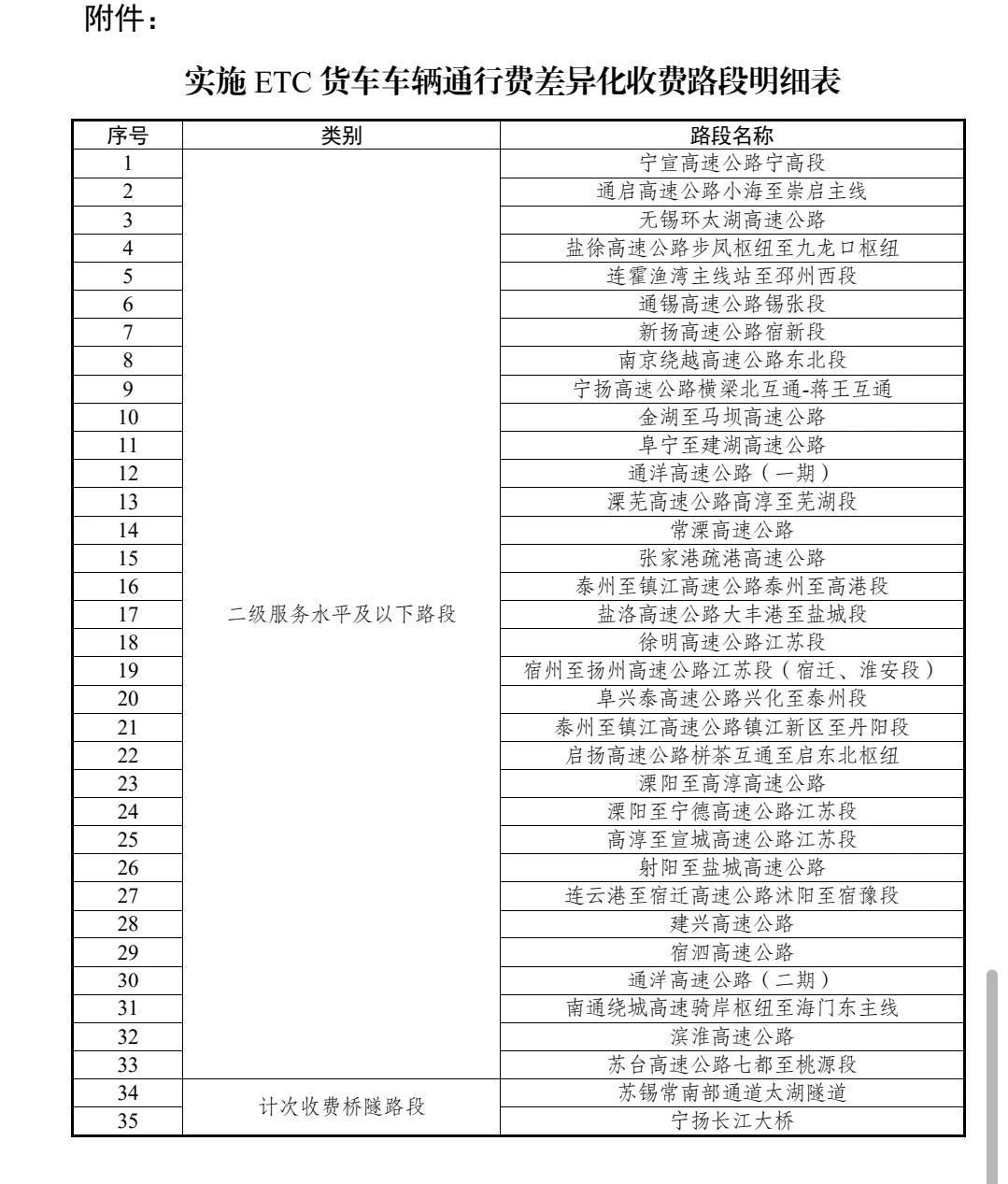 ?。ㄒ唬┤÷?lián)網(wǎng)收費高速公路在繼續(xù)執(zhí)行《關于對高速公路六軸貨車通行費實行差異化收費的通知》(蘇交財〔2020〕4號)和《關于對聯(lián)網(wǎng)收費高速公路2—5軸貨車通行費實行差異化收費的通知》(蘇交財〔2020〕8號)有關差異化收費優(yōu)惠的基礎上,在路網(wǎng)內二級服務水平及以下的路段(具體路段詳見《通知》附件),對安裝并正常使用ETC繳費的3—6類貨車實施車輛通行費85折差異化收費優(yōu)惠;對計次收取車輛通行費的蘇錫常南部高速公路太湖隧道和寧揚長江大橋,由路段經營管理單位以批復的收費標準為上限,根據(jù)路段運行和車流量情況,自主決定對所有安裝并正常使用ETC繳費的貨車實施不低于85折的車輛通行費差異化收費優(yōu)惠,具體優(yōu)惠幅度由路段經營管理單位向社會公告。上述高速公路差異化收費優(yōu)惠不限車籍地、不限ETC卡發(fā)行地,不與其他優(yōu)惠疊加(按照折扣比例就高享受)。