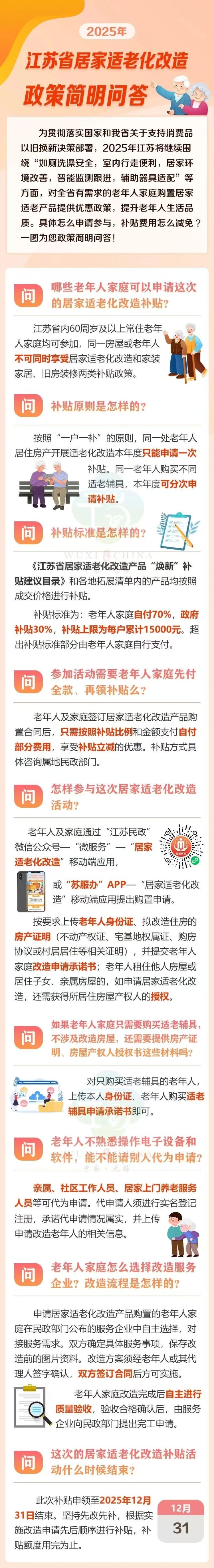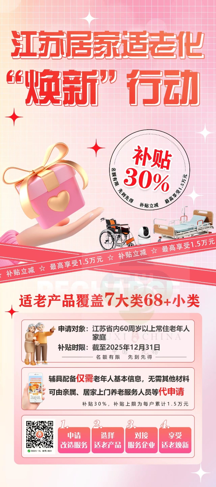 2025年居家適老化改造產(chǎn)品“煥新”行動(dòng)開(kāi)始啦!即日起至12月31日江蘇省老年人家庭購(gòu)置居家適老產(chǎn)品補(bǔ)貼金額最高可達(dá)15000元!