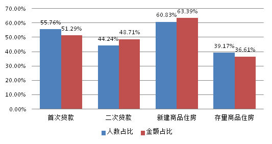 從貸款群體來(lái)看,剛需與改善型住房需求職工分別占貸款總?cè)藬?shù)的29.18%和61.24%。從單位性質(zhì)來(lái)看,以其他城鎮(zhèn)企業(yè)職工為主,貸款筆數(shù)和貸款金額占比分別為40.28%、38.32%。從購(gòu)房面積來(lái)看,職工貸款購(gòu)買小于90㎡、90-120㎡房屋居多,分別占貸款總?cè)藬?shù)的29.18%、33.87%。從主借人繳存基數(shù)來(lái)看,貸款主要以中、低收入職工為主,分別占貸款總?cè)藬?shù)的40.61%、52.78%。從貸款類型來(lái)看,純公積金貸款和組合貸款占比分別為53.49%、46.51%。從貸款結(jié)構(gòu)來(lái)看,首次公積金貸款職工占貸款總?cè)藬?shù)的55.76%,第二次住房公積金貸款人數(shù)僅占44.24%,說(shuō)明我市住房公積金貸款政策在保障剛需職工需求,體現(xiàn)住房公積金互助性方面發(fā)揮了較大的作用,住房公積金制度的初衷未改變。具體放貸結(jié)構(gòu)如下: