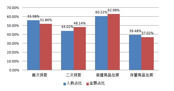 從貸款群體來(lái)看,剛需與改善型住房需求職工分別占貸款總?cè)藬?shù)的27.41%和63.69%。從單位性質(zhì)來(lái)看,以其他城鎮(zhèn)企業(yè)職工為主,貸款筆數(shù)和貸款金額占比分別為41%、39.98%。從購(gòu)房面積來(lái)看,職工貸款購(gòu)買(mǎi)小于90㎡、90-120㎡房屋居多,分別占貸款總?cè)藬?shù)的27.41%、37.18%。從主借人繳存基數(shù)來(lái)看,貸款主要以中、低收入職工為主,分別占貸款總?cè)藬?shù)的41.56%、55.41%。從貸款類型來(lái)看,純公積金貸款和組合貸款占比分別為53.19%、46.81%。從貸款結(jié)構(gòu)來(lái)看,首次公積金貸款職工占貸款總?cè)藬?shù)的55.98%,第二次住房公積金貸款人數(shù)占44.02%,說(shuō)明我市住房公積金貸款政策在保障剛需職工需求,體現(xiàn)住房公積金互助性方面發(fā)揮了較大的作用,住房公積金制度的初衷未改變。具體放貸結(jié)構(gòu)如下: