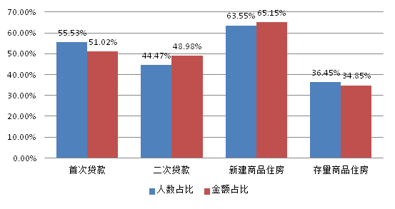 從貸款群體來看,剛需與改善型住房需求職工分別占貸款總人數(shù)的27.82%和64.42%。從單位性質來看,以其他城鎮(zhèn)企業(yè)職工為主,貸款筆數(shù)和貸款金額占比分別為40.49%、39.18%。從購房面積來看,職工貸款購買小于90㎡、90-120㎡房屋居多,分別占貸款總人數(shù)的27.82%、38.25%。從主借人繳存基數(shù)來看,貸款主要以中、低收入職工為主,分別占貸款總人數(shù)的35.13%、63.06%。從貸款類型來看,純公積金貸款和組合貸款占比分別為45.99%、54.01%。從貸款結構來看,首次公積金貸款職工占貸款總人數(shù)的55.53%,第二次住房公積金貸款人數(shù)占44.47%,說明我市住房公積金貸款政策在保障剛需職工需求,體現(xiàn)住房公積金互助性方面發(fā)揮了較大的作用,住房公積金制度的初衷未改變。具體放貸結構如下: